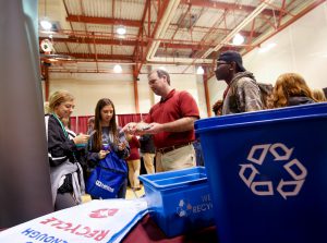 Natalie Hamlin, left, and Kaitlyn Kreps, both seniors at Central Hinds Academy, get information and chat with Jason Pope, director of the Office of Sustainability, at Preview Day at Hinds Community College Raymond Campus on Feb. 2, 2018. (Hinds Community College/April Garon)