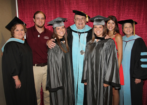 The Bates siblings gather before the graduation ceremony where Carlie and Kayla Bates received their associate degrees. From left are Jackie Granberry, vice president for Advancement and Student Success, Patrick Bates, current Hinds CC student on the Raymond Campus, Carlie Bates, Dr. Clyde Muse, Hinds Community College president, Kayla Bates, Kristin Bates, current Hinds CC student on the Rankin Campus, and Dr. Sue Powell, vice president for both the Rankin and Jackson Campus-Academic/Technical Center. The Bates family is from Pisgah.