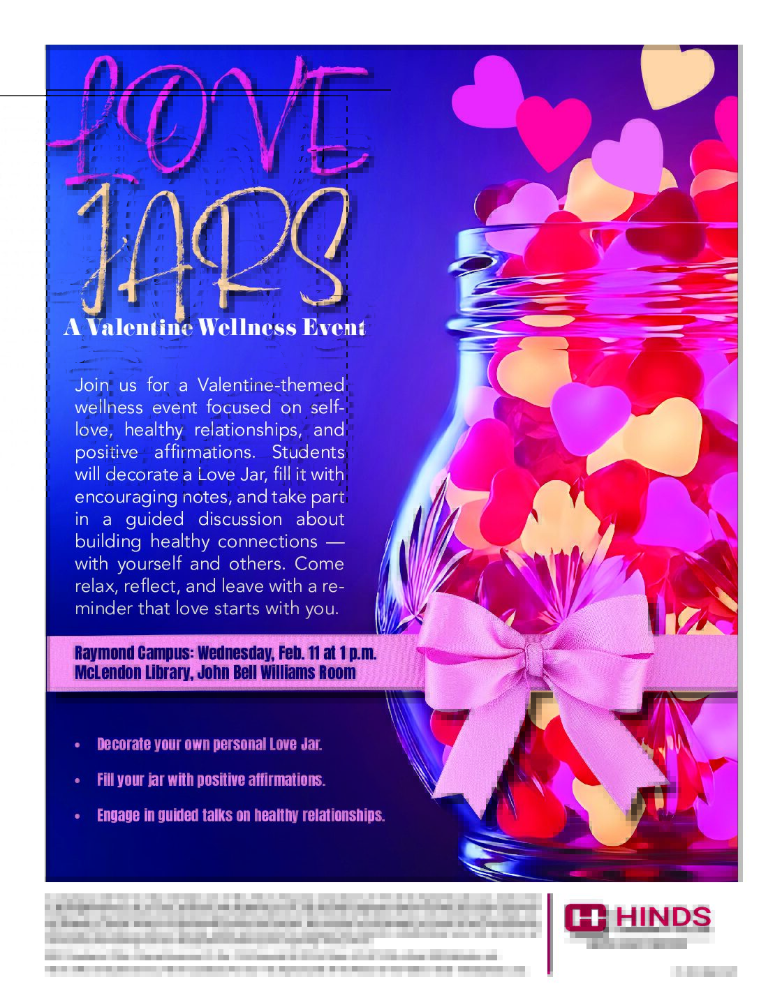 Join us for a Valentine-themed wellness event focused on self-love, healthy relationships, and positive affirmations. Students will decorate a Love Jar, fill it with encouraging notes, and take part in a guided discussion about building healthy connections — with yourself and others. Come relax, reflect, and leave with a reminder that love starts with you. […]