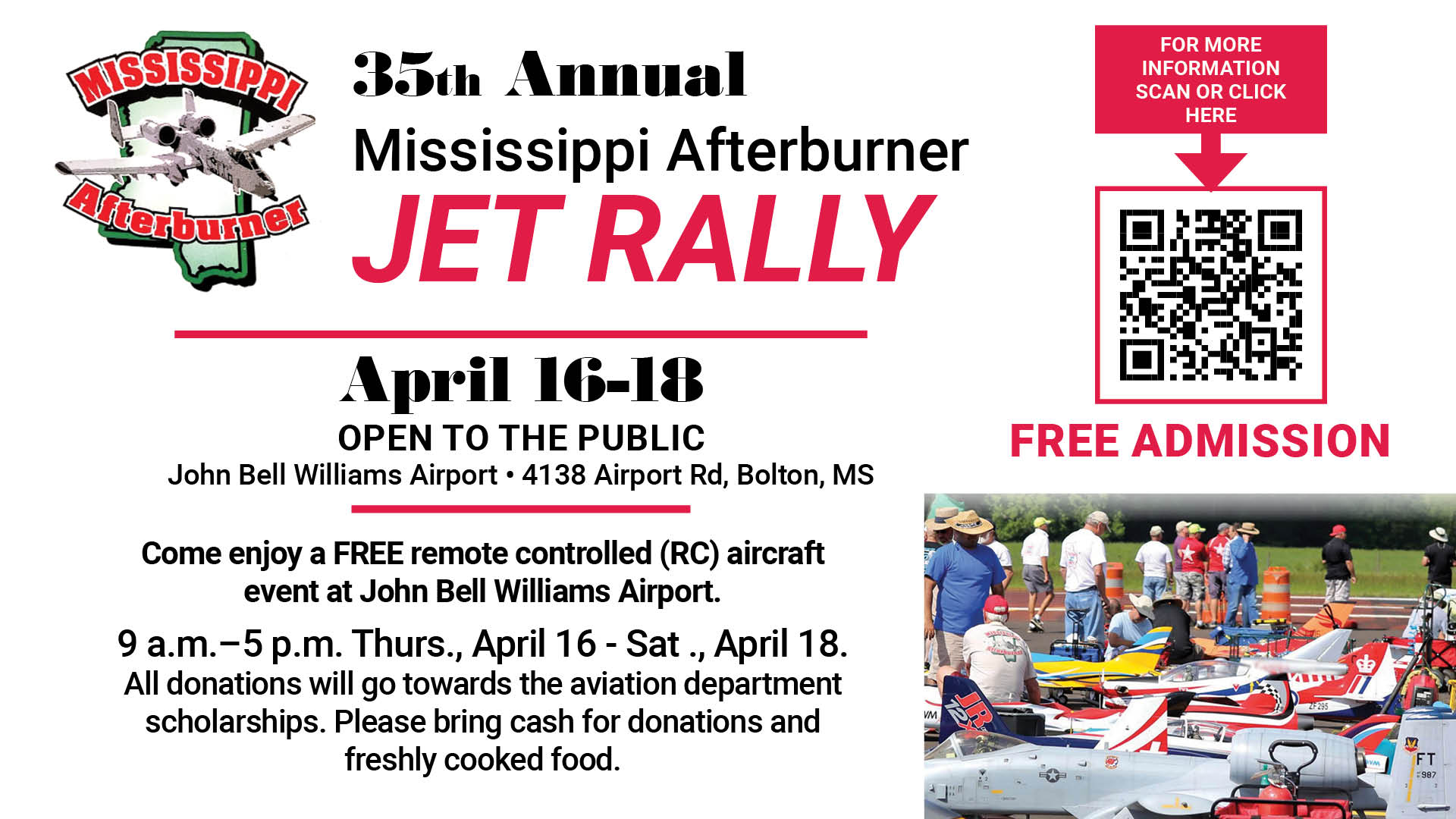 This event is to help raise money for the Aviation Department Scholarship. We will host close to 100 pilots from all over the country flying radio controlled model jets. |