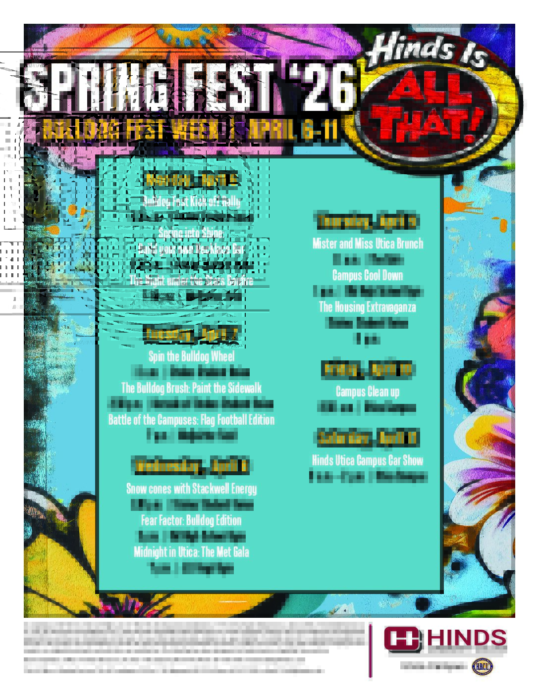 Spring Fest 2026 – Utica CampusDate Apr 6, 2026—Apr 10, 2026Time 8:30 am—12:00 pmVenue Utica CampusLocation 34175 Miss. 18 West, Utica, MS, 39175, Venue Google Map Link + Google MapOrganizer Hinds Community CollegeOrganizer Phone 1-800-HINDSCC 1-800-HINDSCC Add To CalendarGoogle CalendarApple CalendarExport .ics fileOutlook LiveOutlook 360