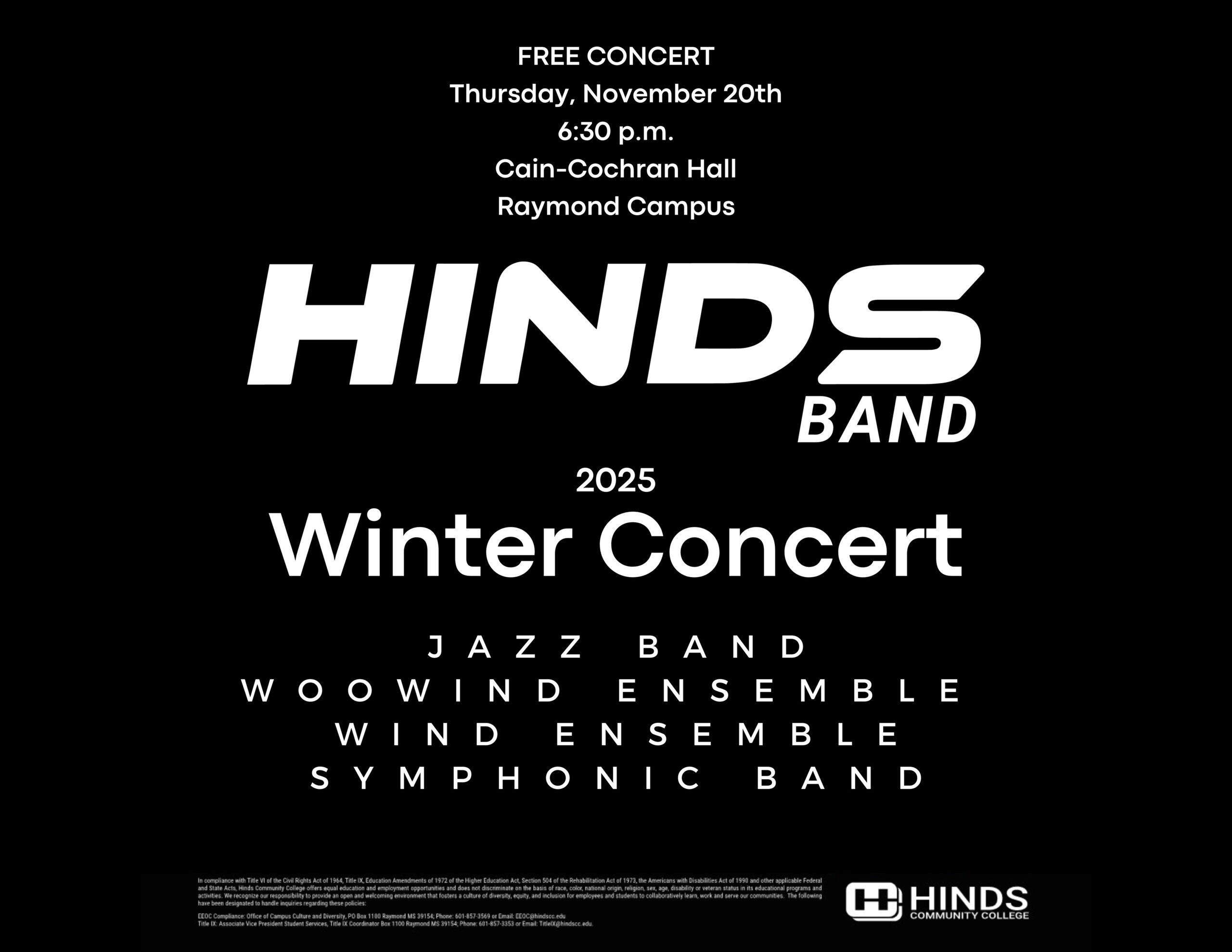 This event has passed.Winter Band ConcertDate Nov 20, 2025Time 6:30 pm—9:00 pmVenue Raymond CampusLocation 608 Hinds Blvd, Raymond, MS, 39154, Venue Google Map Link + Google MapOrganizer Hinds Community CollegeOrganizer Phone 1-800-HINDSCC 1-800-HINDSCC Add To CalendarGoogle CalendarApple CalendarExport .ics fileOutlook LiveOutlook 360