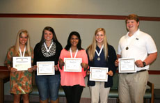 Poetry winnters include, from left, Natalie Brady of Puckett, Puckett Attendance Center, first place; Krista Mathis of Puckett, Puckett Attendance Center, second place; Taren Ashley of Puckett, Puckett Attendance Center, third place; Kali Russell of Pelahatchie, East Rankin Academy, honorable mention; James Flickner of Pelahatchie, East Rankin Academy, honorable mention.