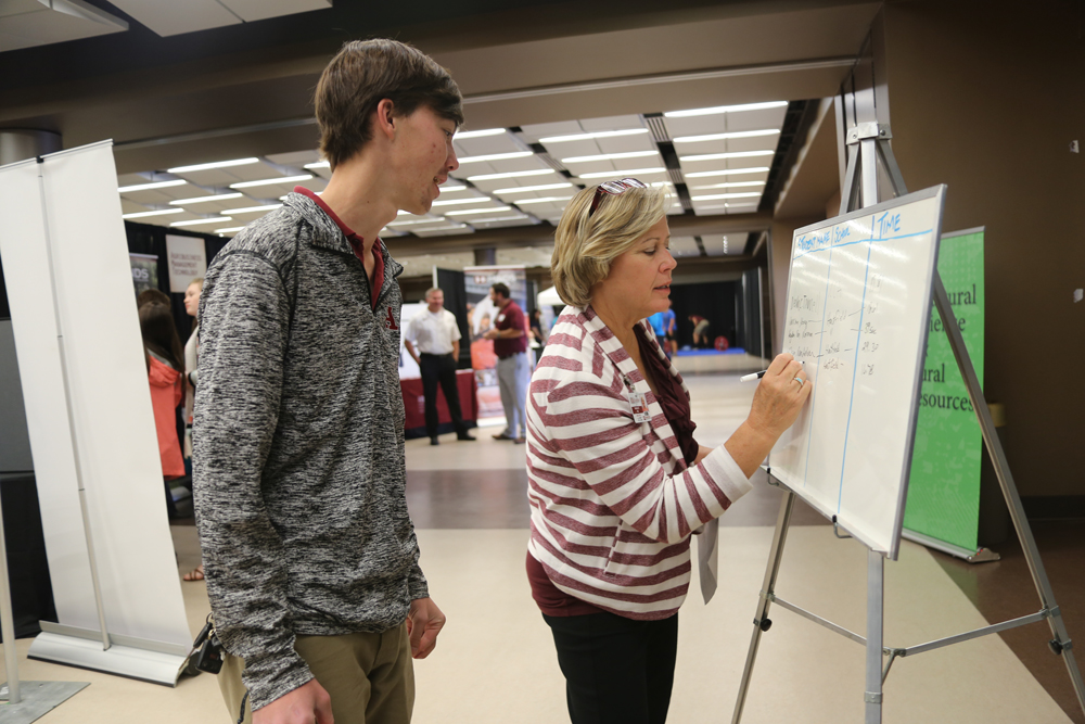 Clinton Christian Academy junior Charsity Ammons of Byram spent some time exploring the Marketing Management Technology booth with the help of Rankin Campus chair Jane Foreman.