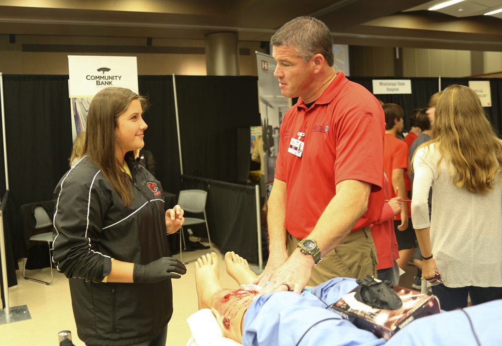 Brian Staley, an instructor in Hinds’ Emergency Medical Sciences program, used a mannequin with a serious leg wound to show Florence eighth-grader Taylor McBay how to use pressure to stop bleeding.