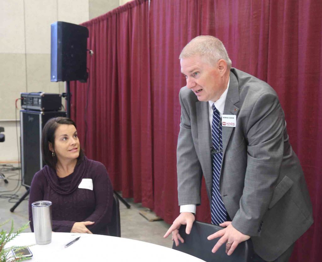- Hinds Community College Vice President Dr. Norman Session talks to Brandon High School counselor Jennifer Welch-Shortt at the Nov. 15 annual Counselors and Principals Workshop.