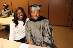 Andrew Love, right, was among 464 students who received credentials from Hinds Community College during summer graduation ceremonies at the Muse Center on the Rankin Campus. Love, of Brandon, graduated with a career certificate in Brick & Block Masonry. With him is interpreter Pam Jones, left. (Hinds Community College/April Garon)