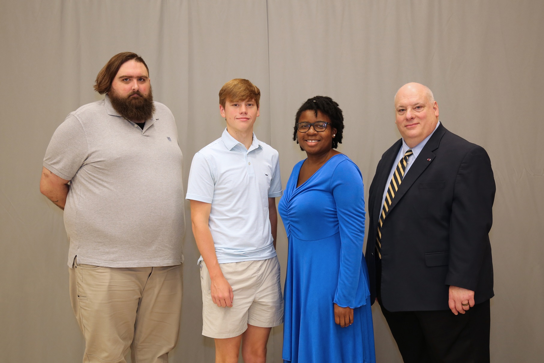 Among those being recognized were Joshua Thornhill of Vicksburg, left, who received the Walter H. and Henrietta Gibbes Career-Tech Endowed Scholarship, Hunter Maw of Raymond, who received the Mr. and Mrs. W.H. Cochran Endowed Scholarship and Destiny Lloyd of Lena, who received the Bo Byrnes Memorial Theatre Endowed Scholarship. With them was Hinds employee Dr. Thomas Ware of Brandon, right.
