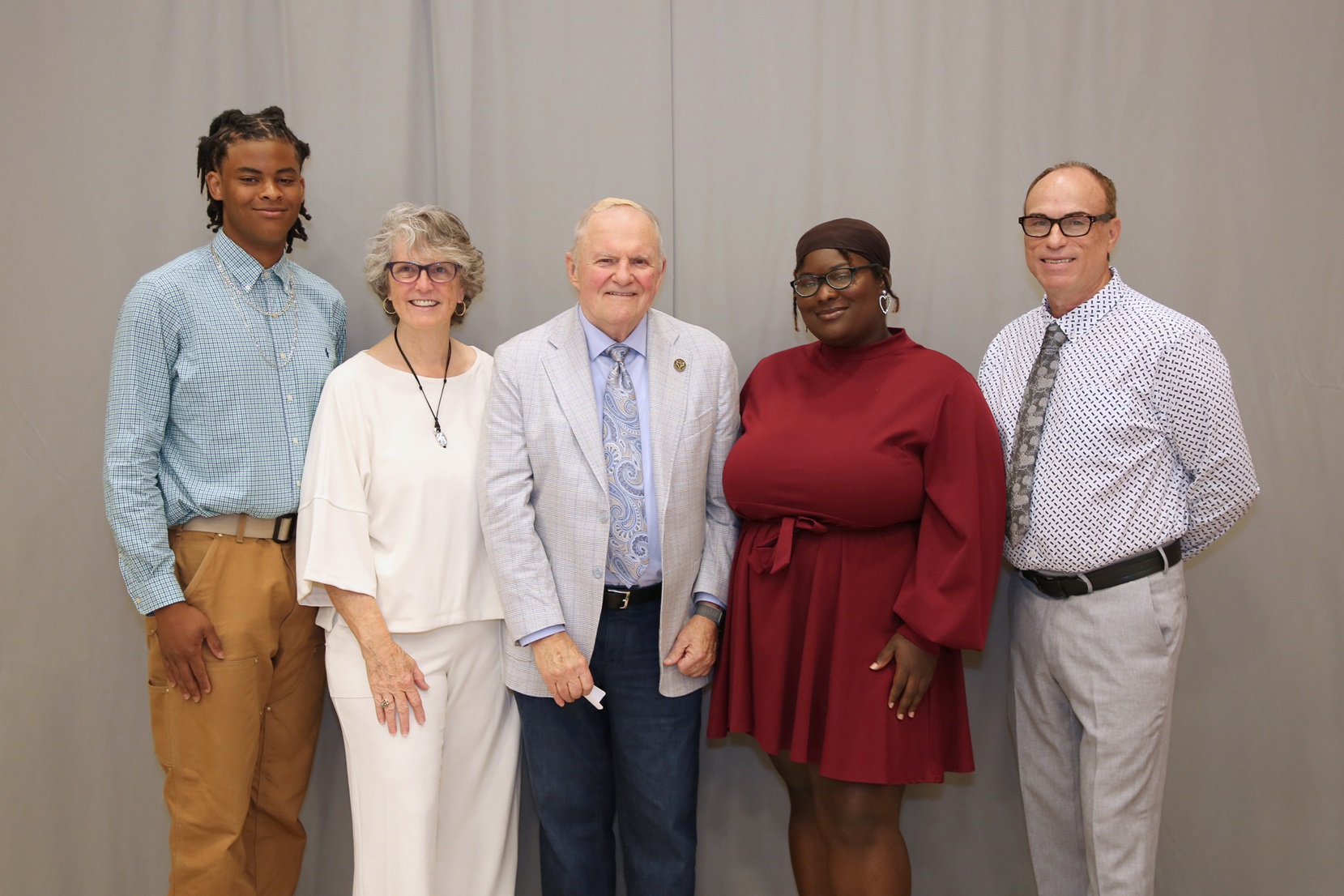 Among those being recognized were Quenton Spann of Lena, left, and Mariah McGill of Pelahatchie, second from right, both of whom received the Manchester Music Legacy Scholarship. With them were Ginger Manchester, second from left, and Dr. John Manchester, both of Clinton, and Hinds employee Marty Robinson, right,