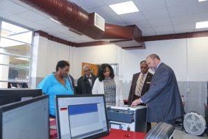 Afterward, four legislators toured two Hinds career-tech labs, the Fab Lab and the Mechatronics lab. The Fab Lab, under the direction of Phil Cockrell, is outfitted with 3-D printing machines, laser cutters and related equipment capable of etching designs or cutting flat sheet material such as acrylic and metal. The machines are programmed by a control panel or computer. Mechatronics, under David Creel, is a blend between electronics and mechanical and was specifically added to the curriculum because of the new Continental Tire plant going up in Hinds County.