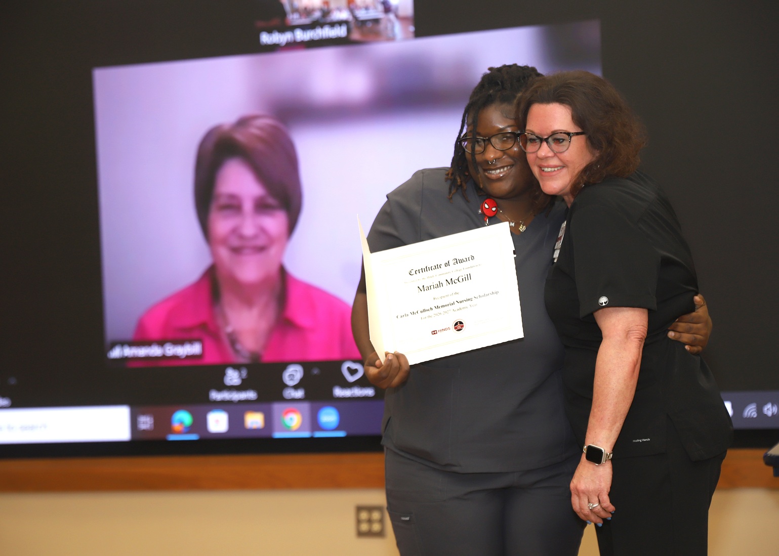 Carol McCulloch of Roanoke, Va., left, viewed the presentation of the nursing scholarship in her daughter’s name by Zoom. The recipient is Mariah McGill of Pelahatchie, center, who is with Angela “Shay” Jennings, Hinds Director of Associate Degree Nursing.