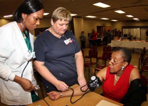 Hinds student Adesola Adefusia of Jackson watches as Elinda Hagan, Health Care Assistant Program instructor, checks the blood pressure of Joyce Adams, life skills instructor at Jackson Campus-Nursing Allied Health Center.