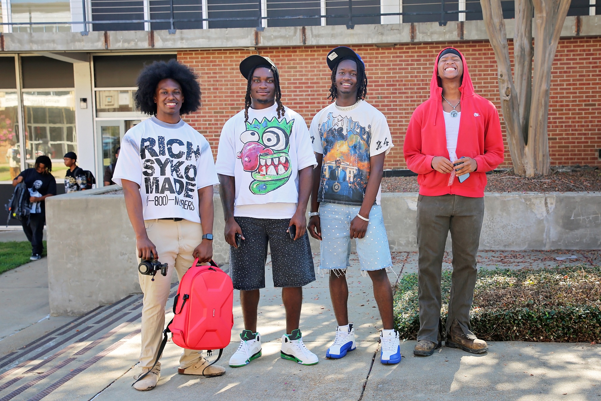 Hinds Community College students sophomore Tommy Louie, 20, of Jackson; freshman Shiloh Johnson, 18, of Starkville; sophomore Jadon Butler, 19, of Natchez; and sophomore Ke’marion Anderson, 19, of Tchula, were part of a campus photo shoot featuring Anderson’s clothing on the first day of school, Aug. 11, 2025.