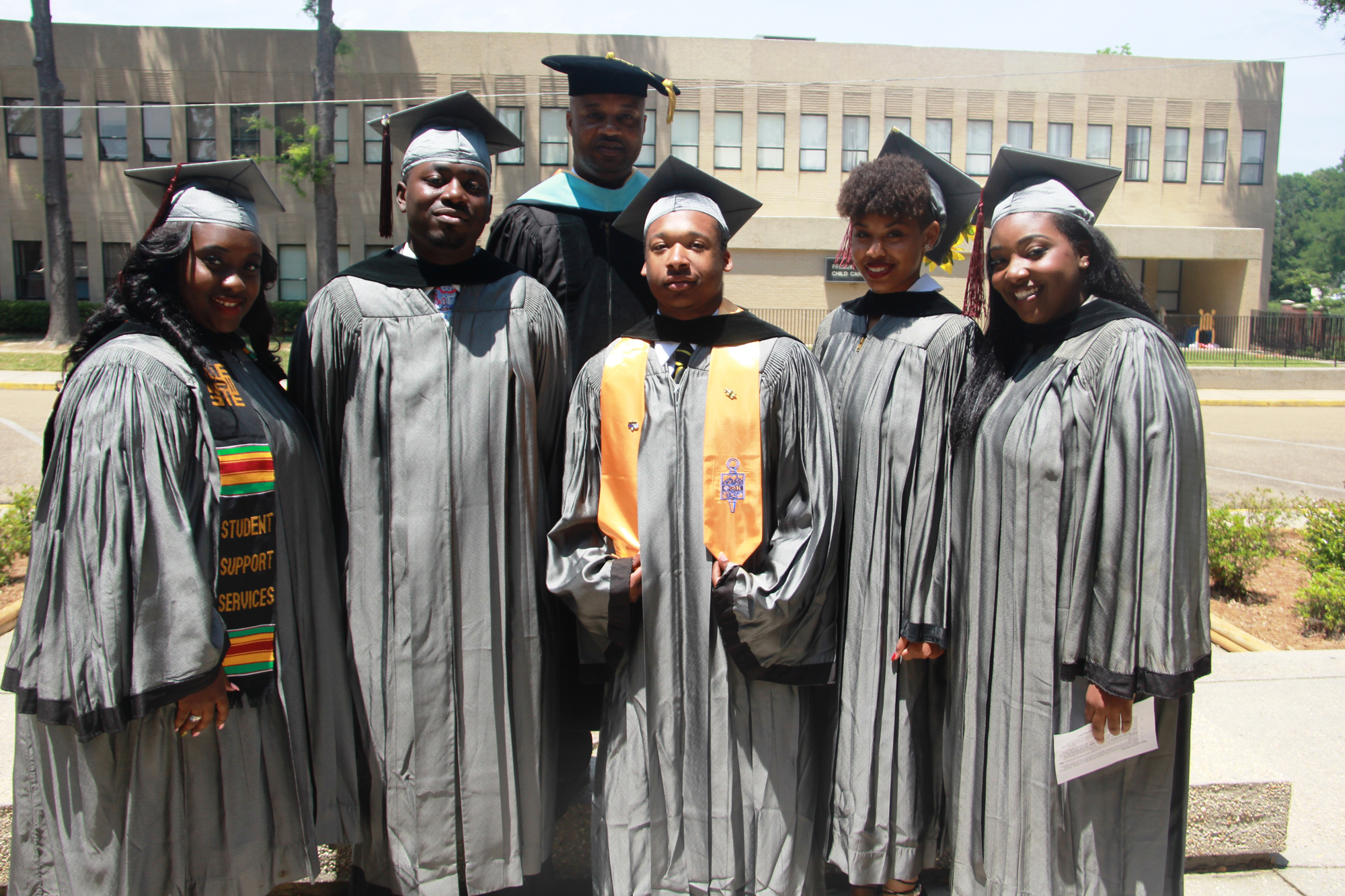 Dr. Mitchell Shears, back row in center, academic dean of the Utica Campus, stands with STEM graduates, from left, Brensha Richardson, Joshua Hodge, Darione Maxie, Classie Bradford and Asia Braxton. (Allison Morris/Hinds Community College)