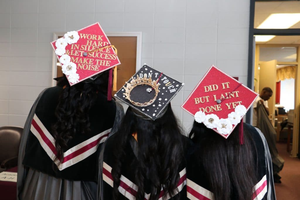 Sporting their thoughts on graduation day are, from left, Reneisha Sweet of Edwards, Kamryn Dismuke of Jackson and Kambrial Love of Terry. They graduated on May 18 at the Utica Campus of Hinds Community College. (Tammi Bowles/Hinds Community College)