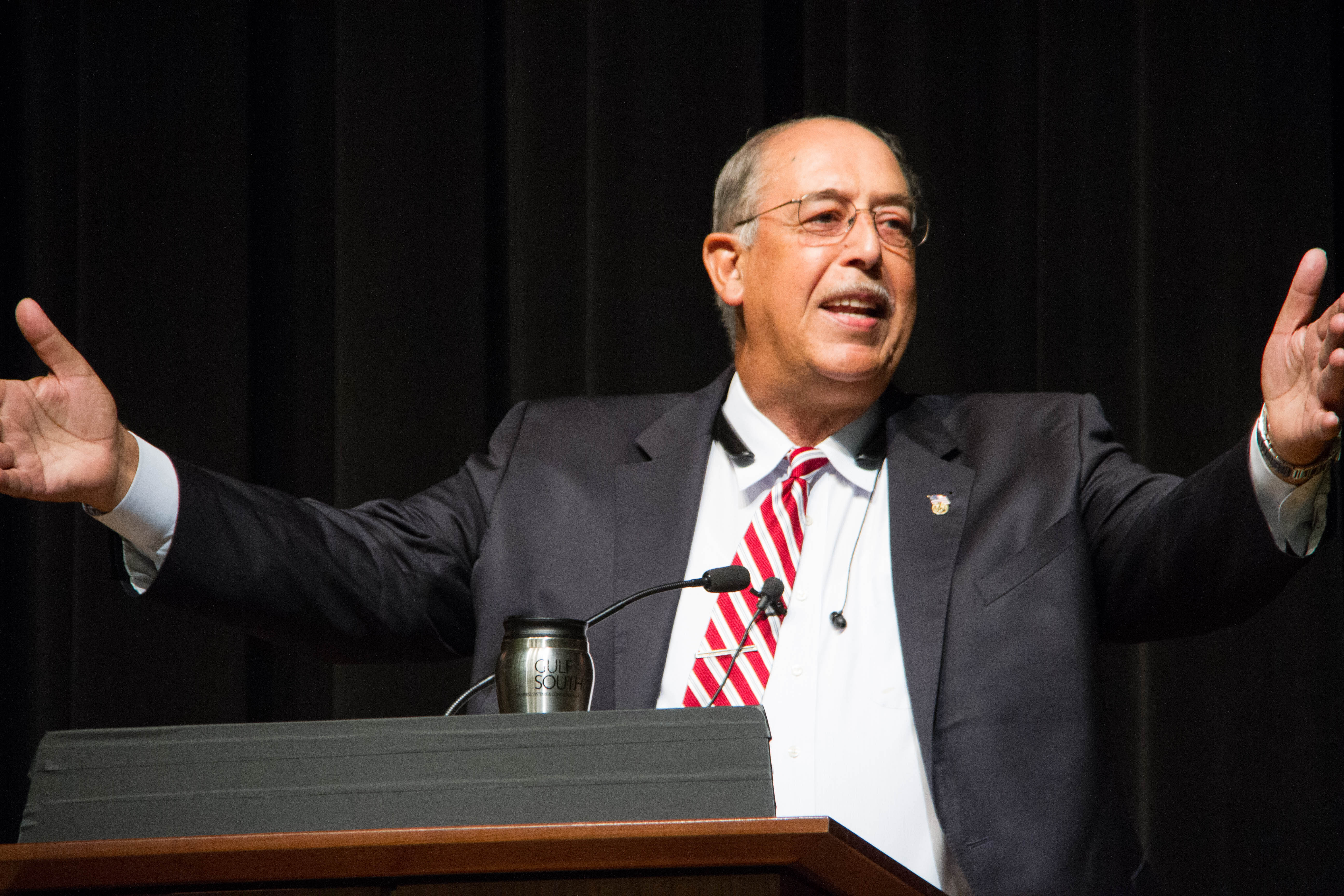 Slides during his address showed a Model of Excellence triangle and the iconic depiction of Gen. George Washington crossing the Delaware River during the American Revolutionary War, which he used as an example of winning the battles of life against long odds.