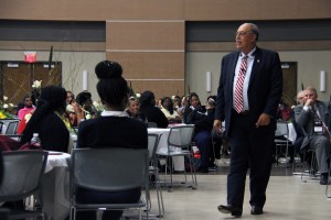 Retired Lt. Gen. Russel L. Honoré addresses the crowd from floor level at the 2015 Minority Male Leadership Initiative Best Practices Summit at the Muse Center on Tuesday, Sept. 15, 2015.