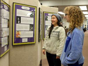 Hinds Community College students Aygul Brown of Yazoo City, left, and Taylor Stockton of Cleveland check out the “Inspiring the Next Generation: Exceptional Mississippi Women” photo exhibit at the McLendon Library on the Raymond Campus.