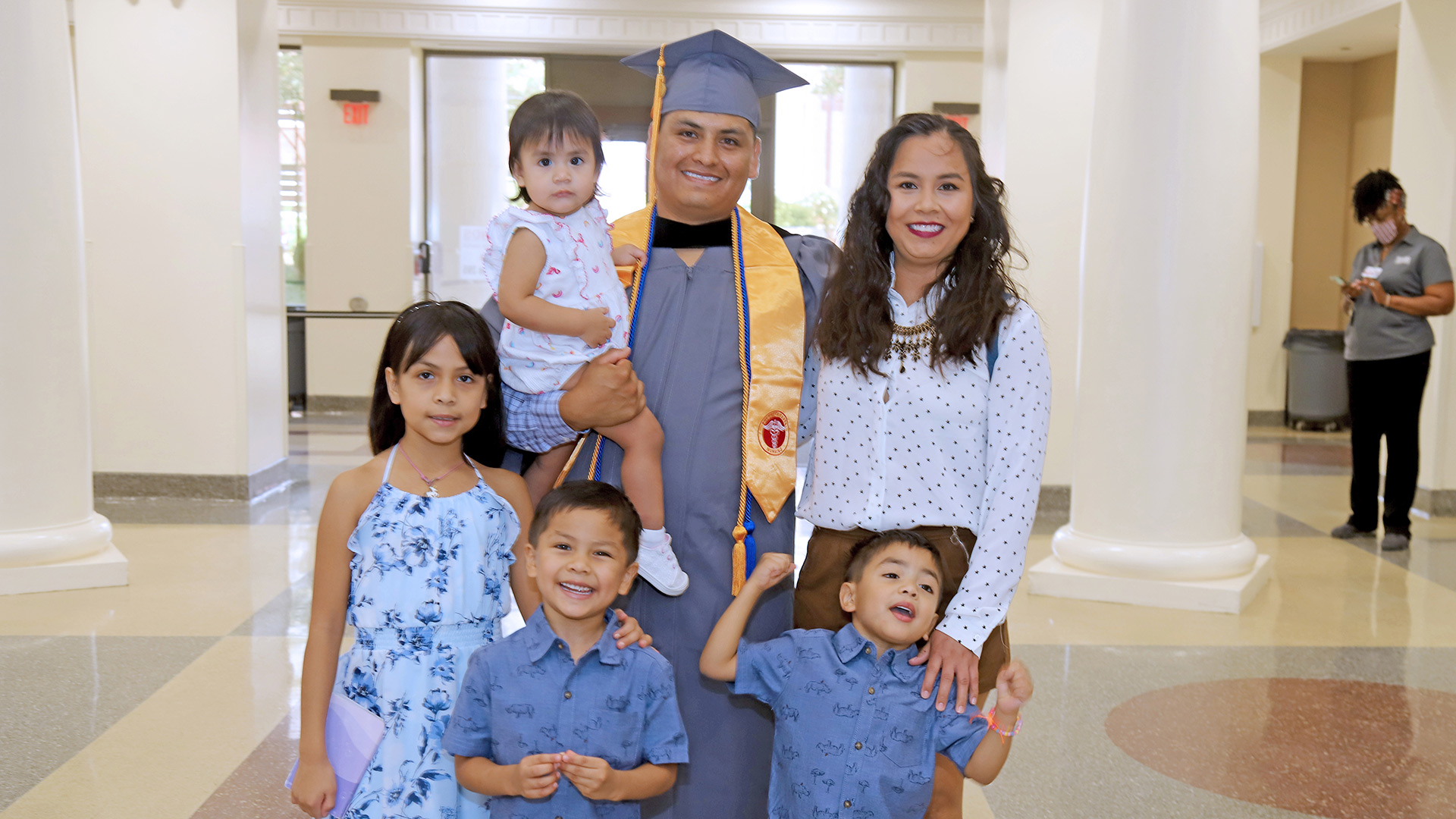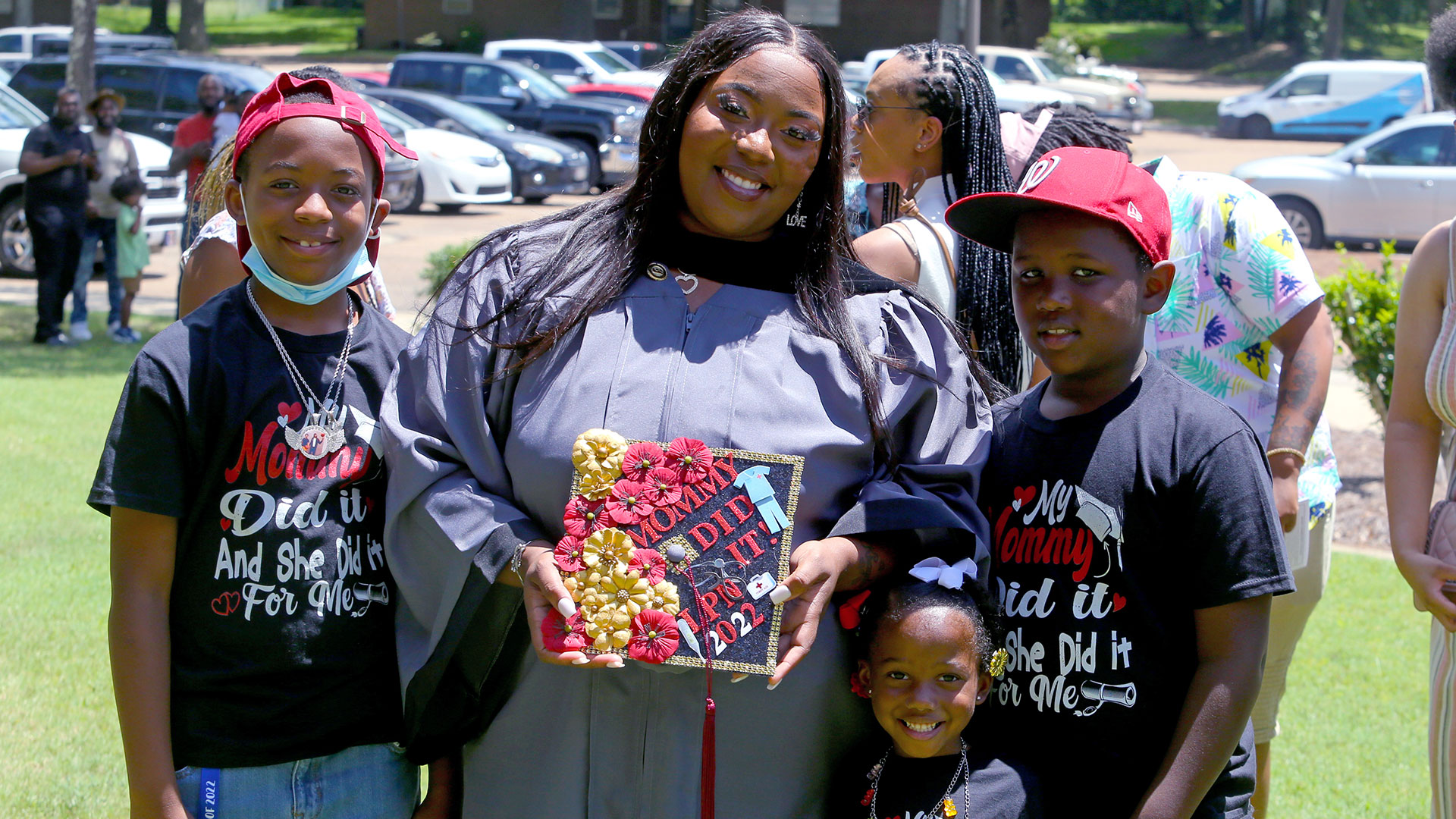 Hinds Community College nursing classmates Sergio Sanchez San Juan of Pearl and Patricia Doty of Byram each brought a spouse and four children to their graduation ceremony on July 28. Both celebrated receiving their Associate Degree in Nursing.