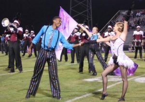Marcus Onezime, left, performs at a half-time show with Hi-Stepper Kayla Mullen.