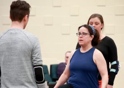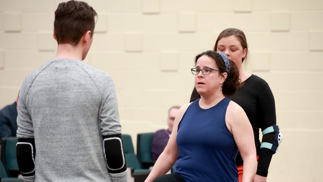 Alison Stafford, center, demonstrates part of a fight scene with students Devin Ranftle, left, and Alyssa Little.