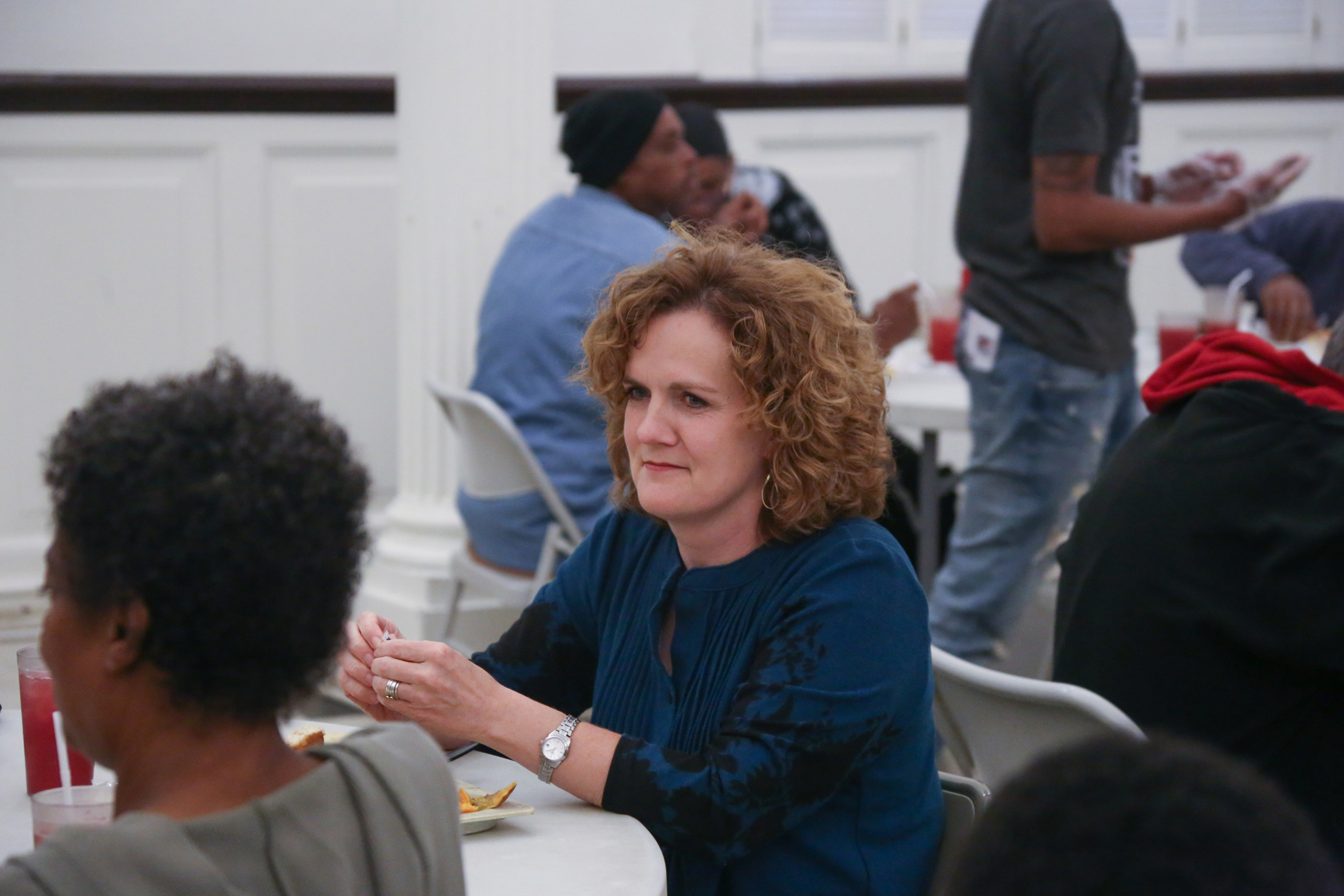 Rev. Jill Buckley shares a few moments with those gathered in the Stewpot Community Services cafeteria where meals are served daily. (Hinds Community College/April Garon)
