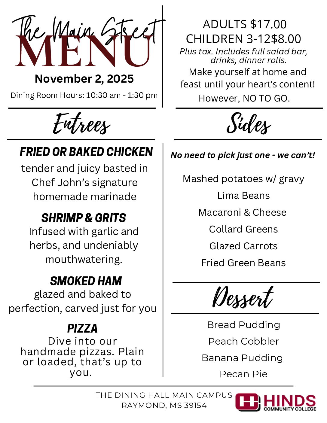 Join us on November 2, 2025, for a mouthwatering brunch hosted by Hinds Community College on the Raymond Campus. From Chef John’s signature fried or baked chicken to shrimp & grits, smoked ham, and handmade pizzas, this menu is packed with Southern comfort and flavor. Pair your entrée with classic sides like mac & cheese, […]